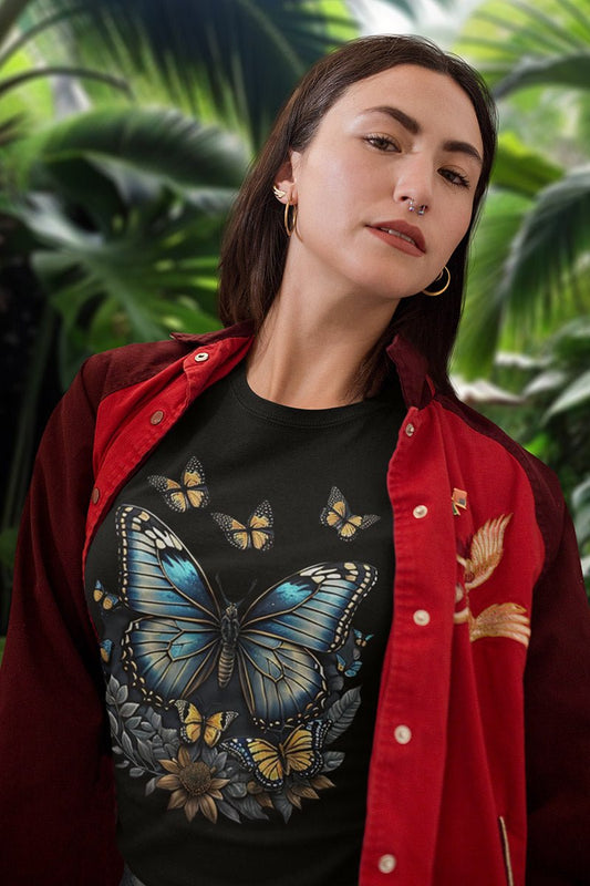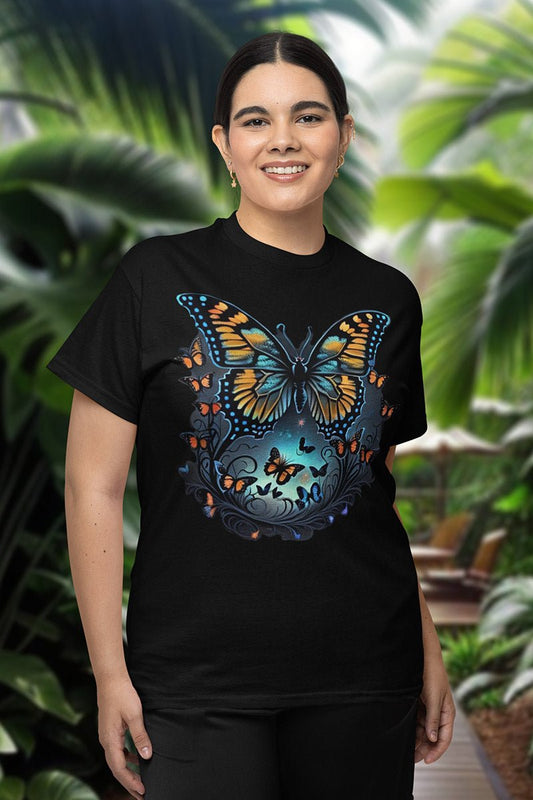 Evening Serenade – Unisex T-Shirt, S-3XL, lebhaftes Schmetterlingsmotiv