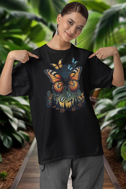 Monarch Night – Unisex T-Shirt, Monarchfalter im nächtlichen Wald