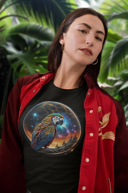 Orbit Ostinato – Unisex T-Shirt, S-3XL, farbenfroher Ara im kosmischen Design