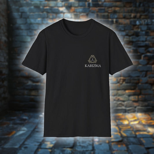 Karizma – Stilvolles Unisex T-Shirt mit Scheren-Logo, Blätterkranz und Hexagon